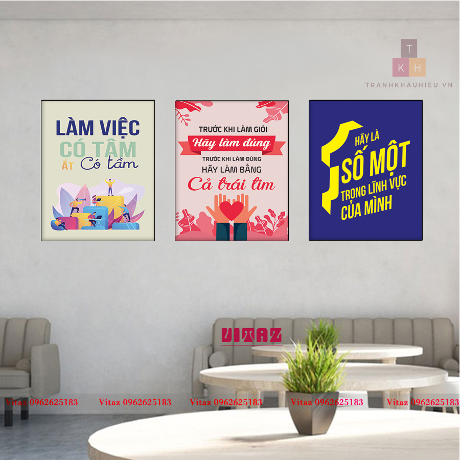 TRANH KHẨU HIỆU Sau khi được Designer thiết kế mẫu tranh khẩu hiệu –  in mực dầu nhập khẩu trên nền vải canvas cao cấp nhập khẩu bởi máy móc, thiết bị Nhật Bản được sản xuất đúng quy trình . Sau đó căng tràn trên khung gỗ mang lại sự tinh tế, hiện đại, đảm bảo chất lượng, hình ảnh sống động, độ tương phản cao, độ bền lên tới 2-3 năm, đảm bảo thẩm mỹ hoàn hảo bởi thợ làm tranh có kinh nghiệm 10 năm.