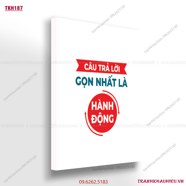 Tranh khẩu hiệu văn phòng với câu slogan ” Câu trả lời gọn nhất là hành động ” có nội dung ngắn gọn, xúc tích được thiết kế một cách tỉ mĩ, thẩm mỹ, năng động, sáng tạo giúp truyền cảm hứng làm việc, động lực phát triển bản thân và trang trí văn phòng.