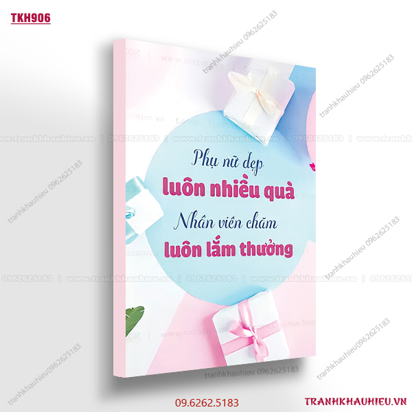 Tranh khẩu hiệu ”Phụ nữ đẹp luôn nhiều quà, nhân viên chăm luôn lắm thưởng” tạo động lực làm việc cực hiệu quả dành cho văn phòng bất động sản, sales, bán hàng, kinh doanh, trang trí văn phòng, truyền cảm hứng làm việc.